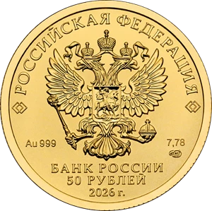 На лицевой стороне монет расположено рельефное изображение Государственного герба Российской Федерации, имеются надписи: «РОССИЙСКАЯ ФЕДЕРАЦИЯ», «БАНК РОССИИ», номинал монет «3 РУБЛЯ», «50 РУБЛЕЙ», год выпуска «2026 г.», обозначение металла по Периодической системе элементов Д.И. Менделеева, проба, товарный знак монетного двора и масса драгоценного металла в чистоте.
