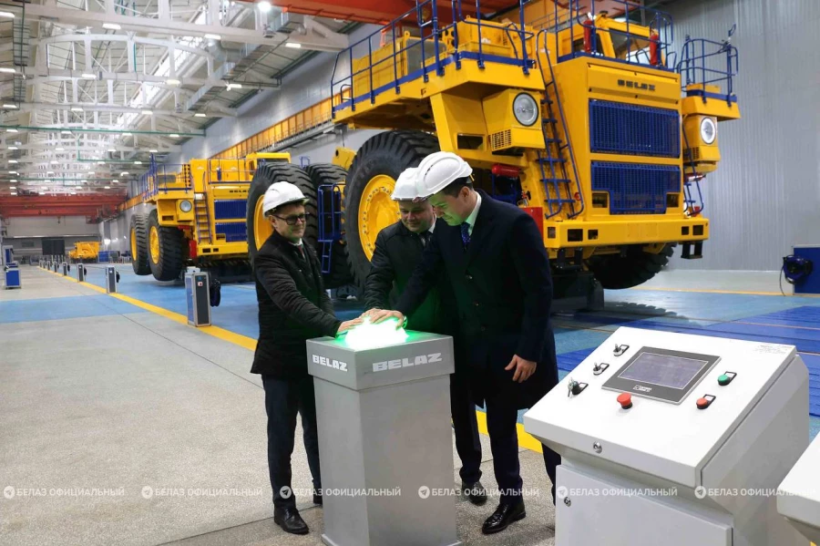Старт работе ленты по сборке карьерных самосвалов особо большой грузоподъемности от 130 до 240 тонн дали министр промышленности Республики Беларусь Андрей Кузнецов и министр промышленности и торговли Российской Федерации Антон Алиханов.
