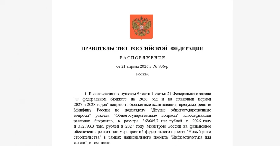 Как следует из документа, Минстрой РФ получит «на финансовое обеспечение реализации мероприятий федерального проекта »Новый ритм строительства« в рамках национального проекта »Инфраструктура для жизни« более 368,68 млн в 2026 году и более 332,79 млн в 2027-м. Средства пойдут на различные субсидии.