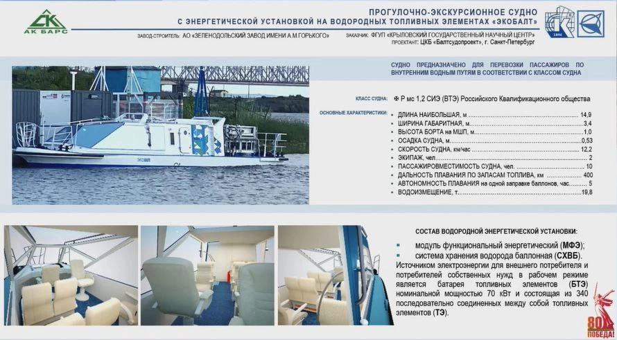 Согласно проекту, на Байкале будет запущено одно прогулочно-экскурсионное судно с энергетической установкой на водородных топливных элементах. Его разработку выполняет Судостроительная корпорация «Ак Барс» (судно строится на заводе компании в Зеленодольске) и «Крыловский государственный научный центр». Длина такого туристического кораблика – почти 15 м, он рассчитан на десять пассажиров и двух членов экипажа, развивает скорость 12,2 км/ч.