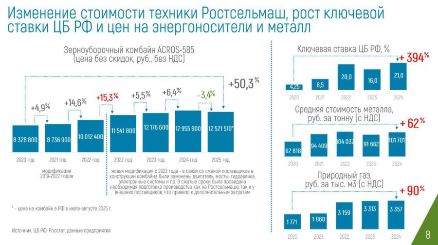 При этом зерноуборочный комбайн ACROS-585 в 2023 году по сравнению с 2022 годом подорожал только на 5,5%, в 2024 году по сравнению с 2023 годом — на 6,4%, а в 2025 году по сравнению с 2024 годом цена на него снизилась на 3,4%, до 12,5 млн руб. (указана цена комбайна в РФ в июле-августе 2025 года).