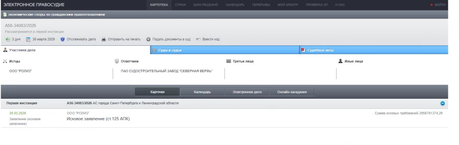 Карточка иска ООО «Ролиз» к «Северной верфи». Иллюстрация — картотека арбитражных дел.