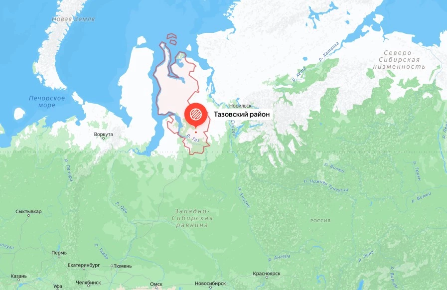Русское нефтегазоконденсатное месторождение расположено в Тазовском районе Ямало-Ненецкого автономного округа, в 135 км к юго-востоку от села Hаходка Ямало-Ненецкого автономного округа. Изображение: Яндекс Карты.